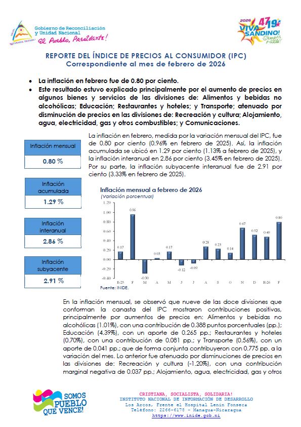 INIDE informa sobre el comportamiento del Índice de Precios al Consumidor (IPC) Febrero 2026